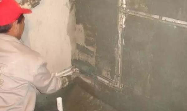 然后在不漏水部位按照材料使用要求,大面积涂抹聚合物水泥防水砂浆,需分层抹压,顺序为防水素浆--防水砂浆--防水素浆,最后拨管堵水。